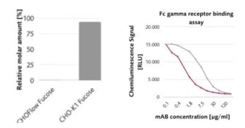 除已有的CHOzen®細(xì)胞系和GLYCOEXPRESS® (GEX®)細(xì)胞系外,漢騰生物新推出的巖藻糖基轉(zhuǎn)移酶8敲除的CHO細(xì)胞系,可賦予重組表達(dá)的單抗無巖藻糖修飾的特性。該細(xì)胞系在產(chǎn)量和生長(zhǎng)與野生型CHO K1一致的條件下,無巖藻糖抗體與FcγRs抗原親和力提高,ADCC效應(yīng)加強(qiáng)。