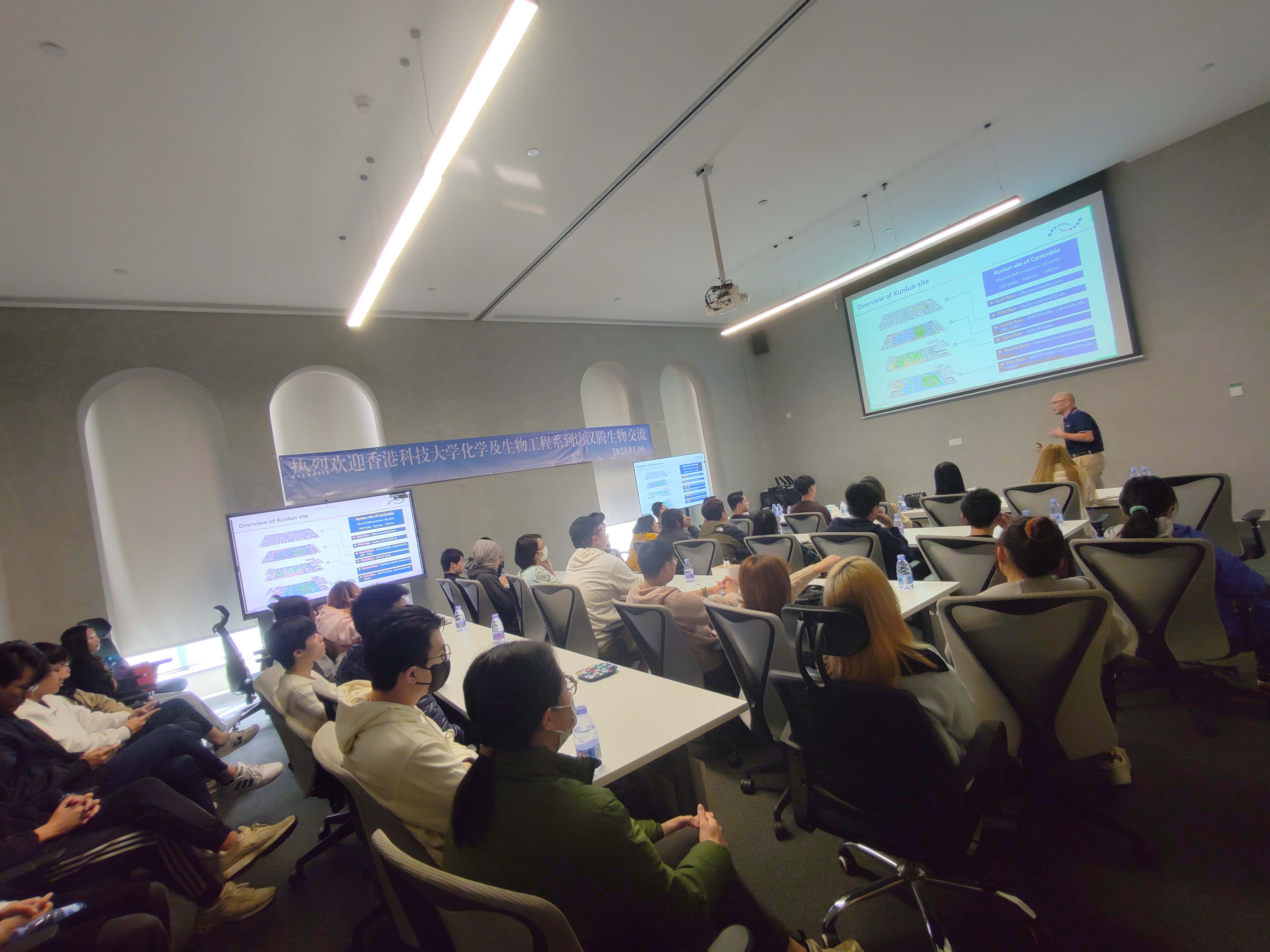 2024年1月5-6日,香港科技大學劉元帥教授帶領40多名來自化學與生物工程系的師生到訪漢騰生物(Canton Biologics), 副總裁張春華先生代表漢騰高管團隊熱情接待了來訪嘉賓并作歡迎致辭。這是繼2023年10月漢騰生物CEO沈瀟博士在香港科大舉行專題演講交流后,雙方的又一次深度的合作互動和探討。