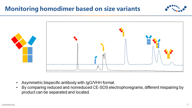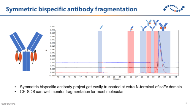 對(duì)稱性抗體通過鏈接亞基來實(shí)現(xiàn)雙特異性,但容易出現(xiàn)共價(jià)結(jié)合的聚集體或者在亞基上發(fā)生的斷裂。因此需要在工藝研發(fā)過程中重點(diǎn)關(guān)注聚集體和碎片,例如使用毛細(xì)管凝膠電泳監(jiān)控碎片。