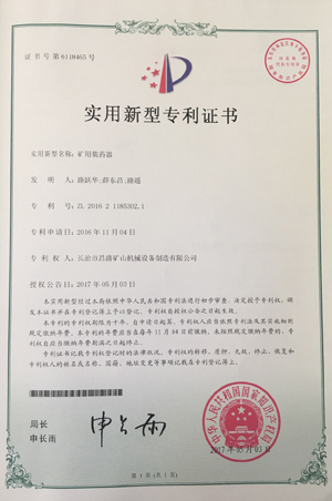 恭賀我公司產(chǎn)品礦用裝藥器于2017年5月3日再次獲得國(guó)家專利證書 專利證號(hào):ZL 2016 2 1185302.1