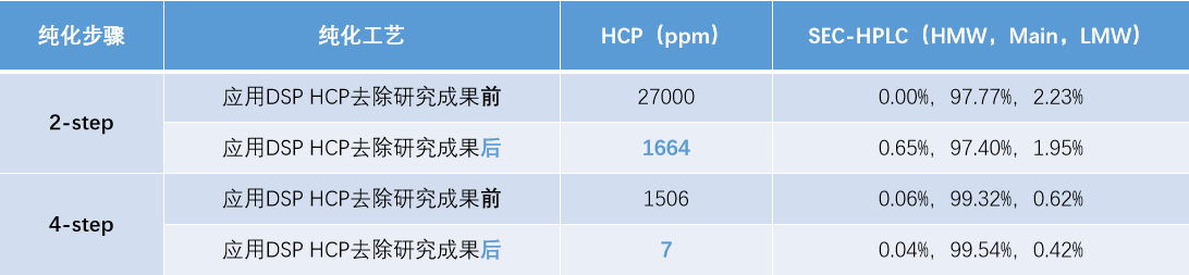無論采用2步層析工藝抑或4步層析工藝,應用DSP關于HCP去除的研究成果后,此項目產(chǎn)品中的HCP殘留均大幅下降,SEC純度保持不變。有效清除了工藝殘留雜質(zhì)(HCP 低于10ppm;對比已上市同類別產(chǎn)品的900ppm有顯著下降)。
